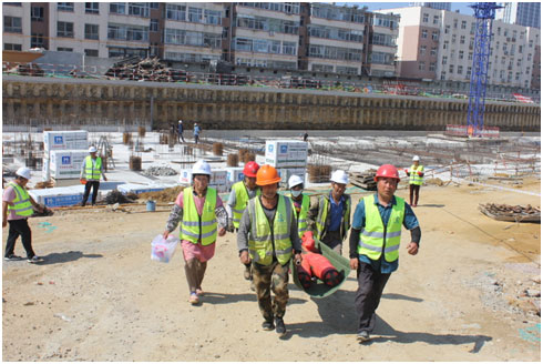 本次演練模擬為施工現(xiàn)場材料堆場出現(xiàn)火情和坍塌,施工人員發(fā)現(xiàn)后立即向項(xiàng)目經(jīng)理報(bào)告,項(xiàng)目經(jīng)理根據(jù)現(xiàn)場情況立即啟動(dòng)應(yīng)急預(yù)案。項(xiàng)目部全員按照應(yīng)急預(yù)案進(jìn)行疏散逃生。醫(yī)療救護(hù)組、安保組、綜合協(xié)調(diào)組等迅速集結(jié),在做了緊急部署后,搶救傷員、滅火行動(dòng)組同步行動(dòng),整個(gè)演練井然有序進(jìn)行。